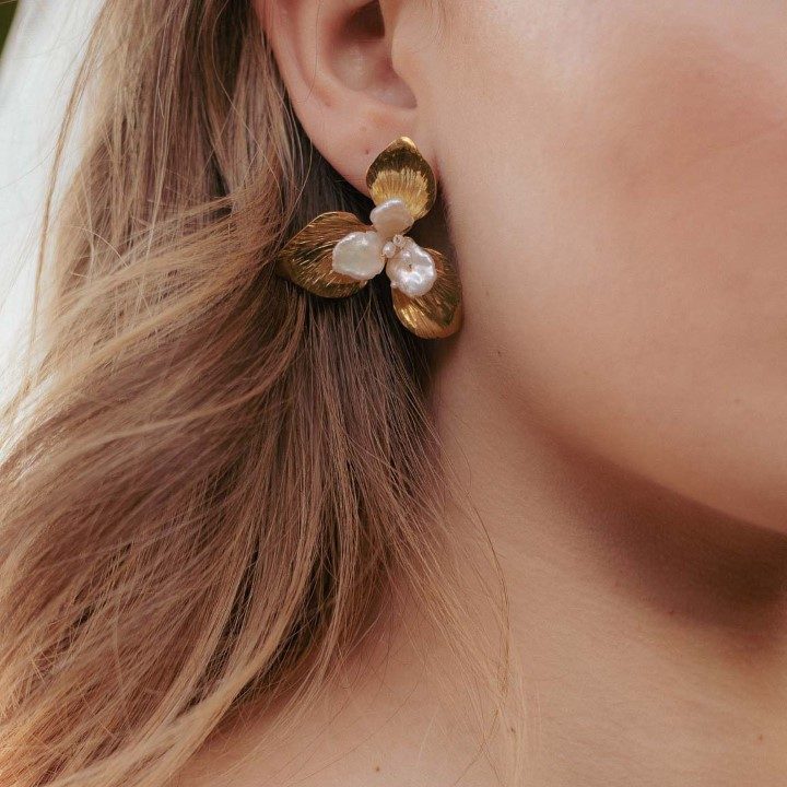 Orchid earrings feature hand-sculpted petals with soft, flowing lines that capture the flower’s natural elegance. Each petal is carefully textured by hand, paired with lustrous freshwater pearls to create a design that radiates rare beauty and purity. Ideal for making a bold floral statement. Available in Sterling silver, Yellow gold plating and Rose gold plating.
